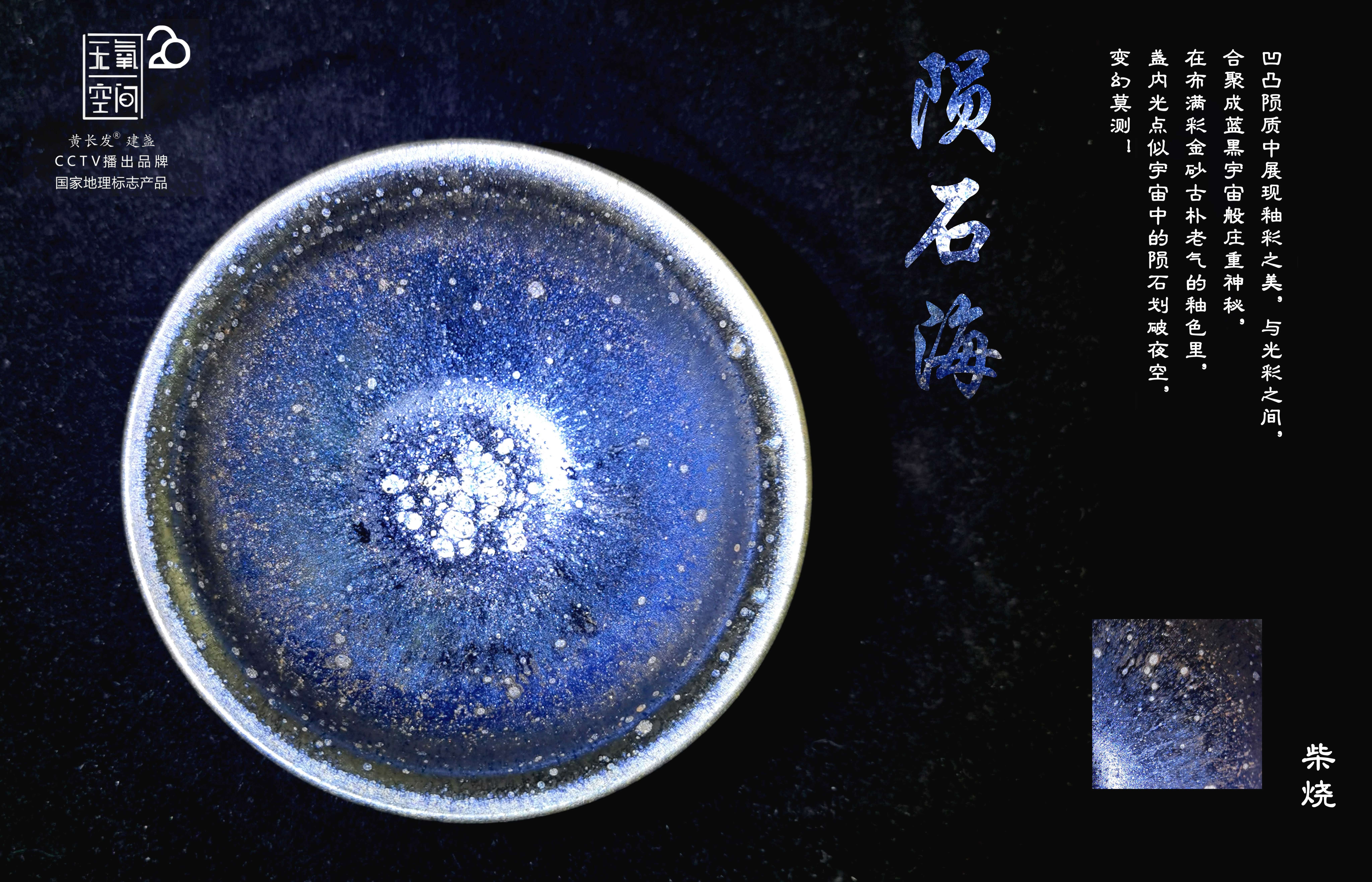 凹凸隕質(zhì)中展現(xiàn)釉彩之美,與光彩之間,合聚成藍(lán)黑宇宙般莊重神秘,在布滿彩金砂古樸老氣的釉色里,盞內(nèi)光點(diǎn)似宇宙中的隕石劃破夜空,變幻莫測(cè)!